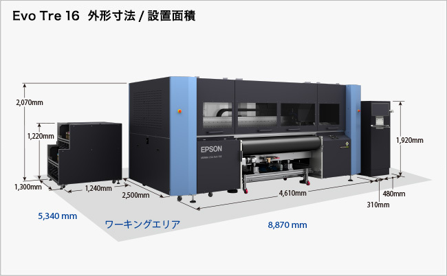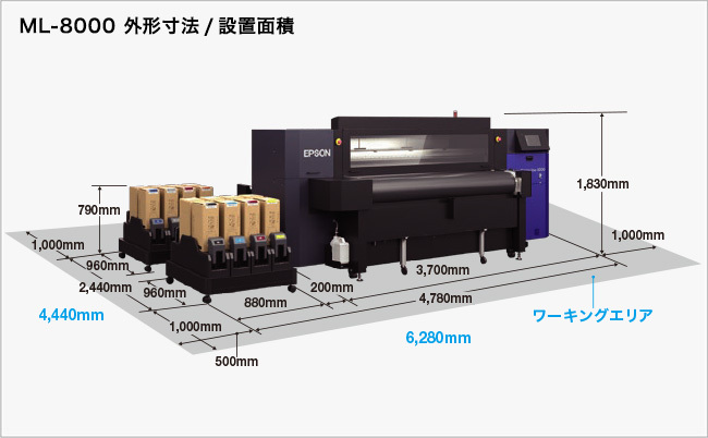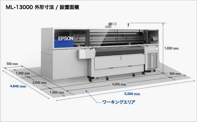 | 外形寸法 | 捺染機本体 | 幅約6,500 x 奥行約4,960 x 高さ約2,530(mm) | 幅約4,610 × 奥行約2,500 × 高さ約2,070(mm) | 幅約4,610 × 奥行約2,500 × 高さ約2,070(mm) | 幅約3,700 × 奥行約2,690 × 高さ約1,830(mm) | 幅約4,200 × 奥行約2,640 × 高さ約1,830(mm) |