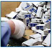 回収センターへ送られてきた使用済みのインクカートリッジは、係員の手で分解/分別されます。