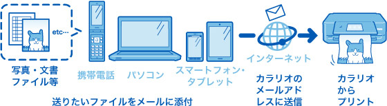プリントしたい写真や文章をメールに添付してカラリオに送信するだけ。どこからでもカンタン、キレイにプリントできます。