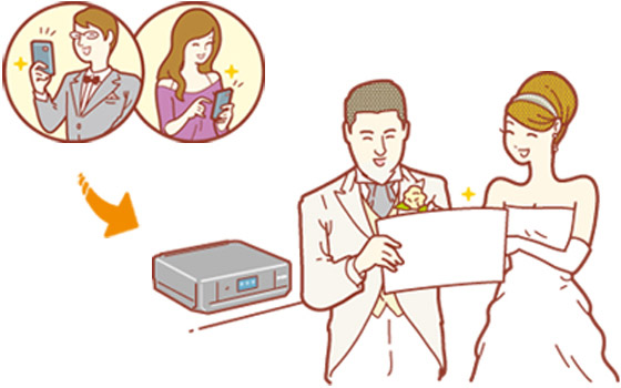結婚式の招待状にカラリオのアドレスを書いておいて、 来られない人からお祝いメッセージや写真を送ってもらいましょう。 当日、式中次々と素敵なメッセージがプリントされます。