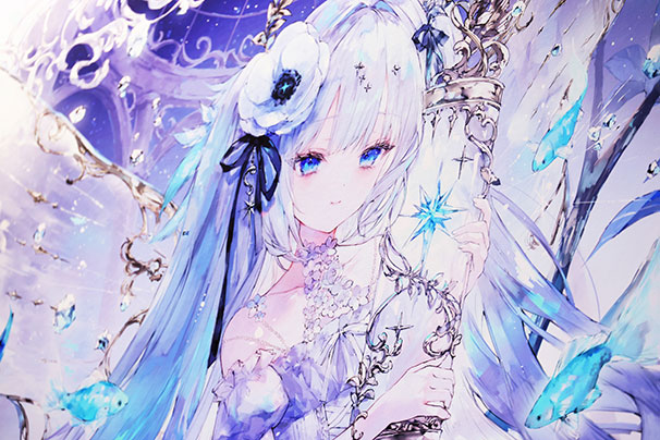 ジークレー作品(注1)、キャンバス地などへの大判プリント、壁紙プリント、等身大パネル、透明フィルムプリント、マグカップやアクリルキーホルダーなどのグッズ類、プロジェクターによるアニメーション投写など