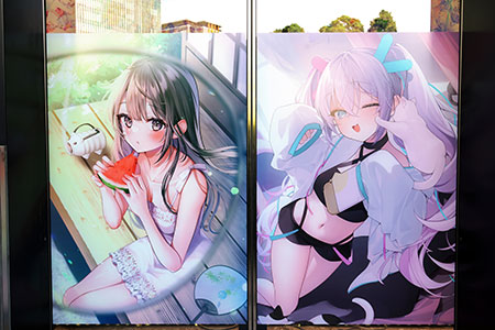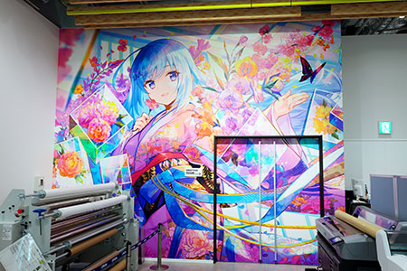 ジークレー作品(注1)、キャンバス地などへの大判プリント、壁紙プリント、等身大パネル、透明フィルムプリント、マグカップやアクリルキーホルダーなどのグッズ類、プロジェクターによるアニメーション投写など