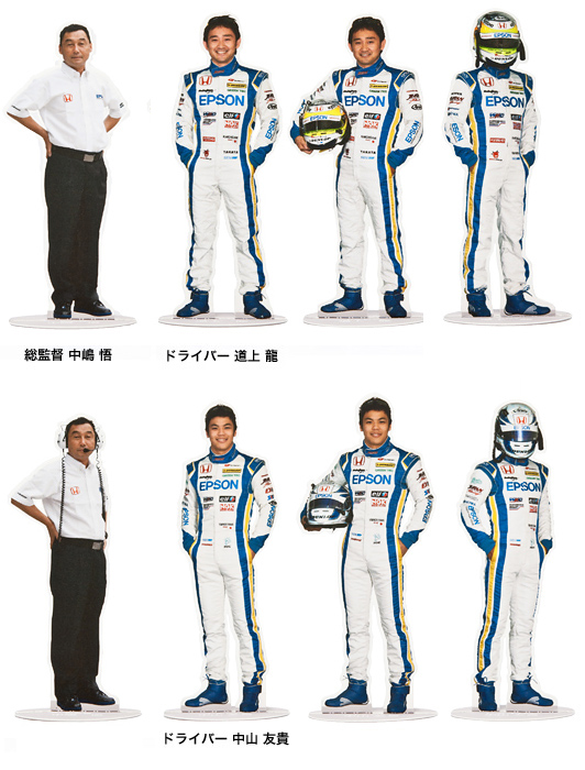 エプソン・ナカジマレーシングを率いる中嶋悟総監督と2012年チームドライバーの道上龍、中山友貴のペーパークラフト。