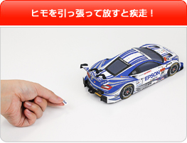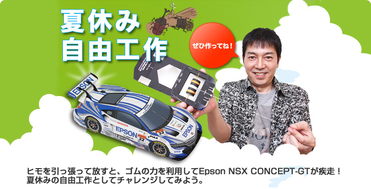 ヒモを引っ張って放すと、ゴムの力を利用してEpson NSX CONCEPT-GTが疾走!夏休みの自由工作としてチャレンジしてみよう。