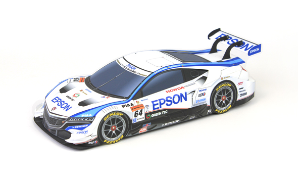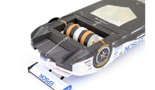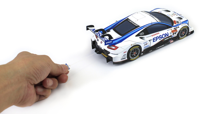 ヒモを引っ張り放すと、輪ゴムの力を利用してEpson NSX CONCEPT-GTが走ります。自由工作にもピッタリのペーパークラフトです。