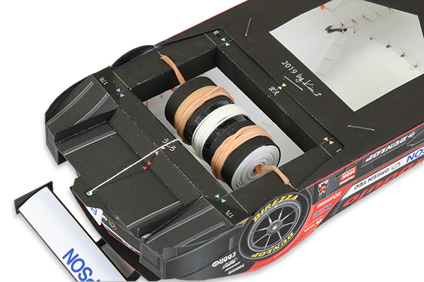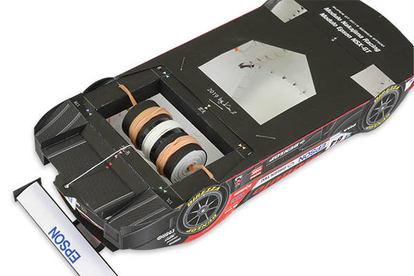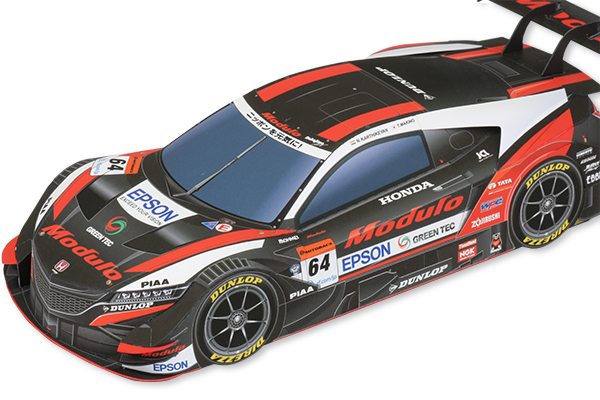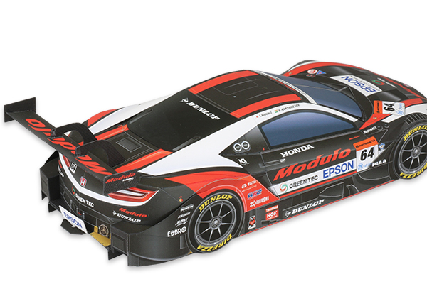 輪ゴムの力を利用してModulo Epson NSX-GTを走らせる動くペーパークラフト。夏休みの自由工作におすすめです。