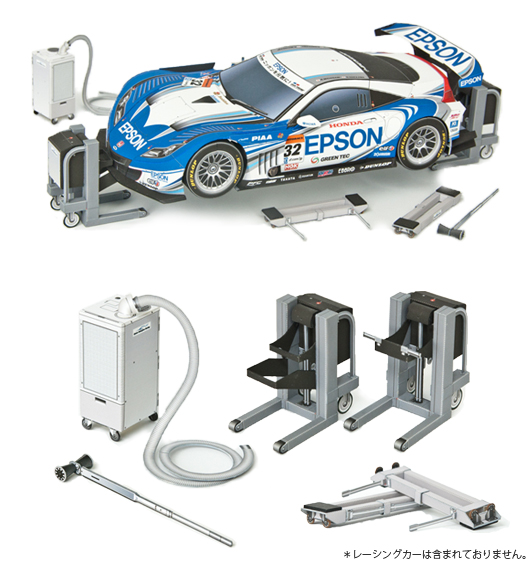 ピット内には、たくさんの工具やパーツが存在している。今回、電動ジャッキ、車両移動用ツール、スポットクーラー、トルクレンチをリアルに再現。