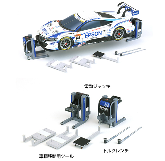 Epson NSX CONCEPT-GTを昇降させる「電動ジャッキ」から車輌の向きを回転させる「車輌移動用ツール(通称ゴロゴロ)」、「トルクレンチ」をリアルに再現しました。