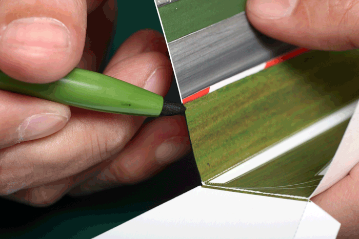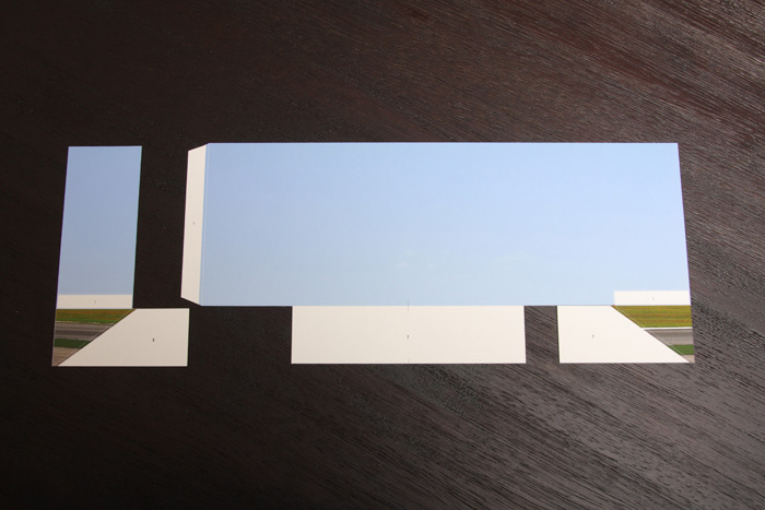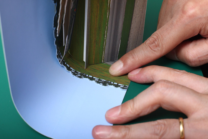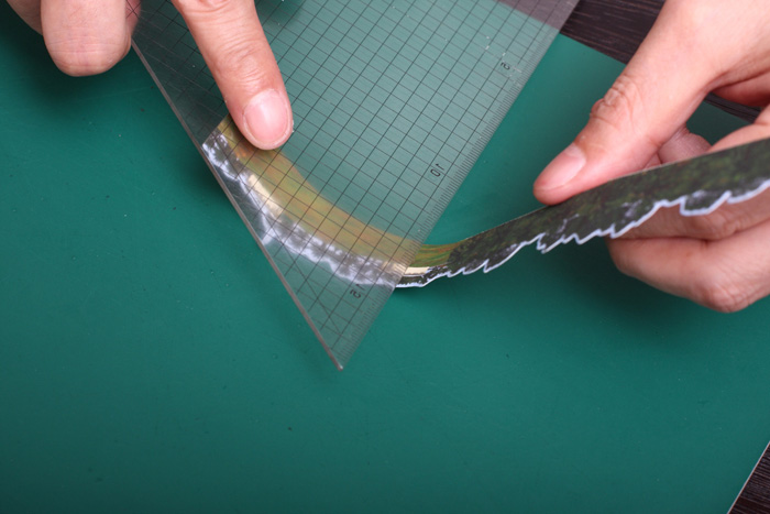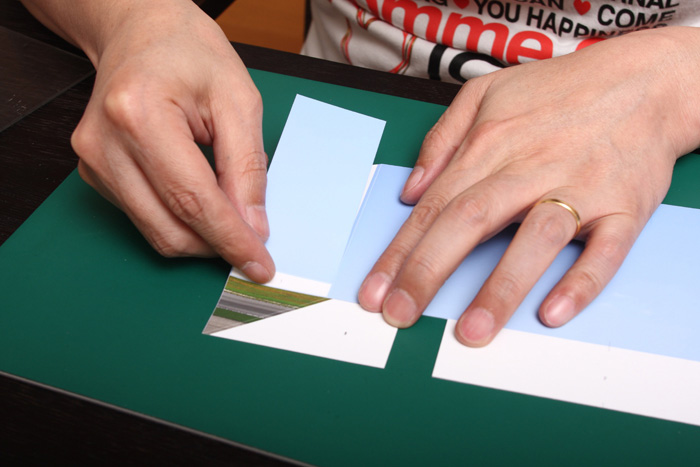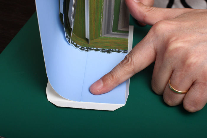 続いて背景の空にあたる部分を制作します。パーツを貼り合わせて一枚のパーツにし、台座の後ろから囲うようにしてはりあわせます。まず台座の後ろ側に固定して、ジオラマパーツののりしろ部分を貼り合わせていくとよいでしょう。