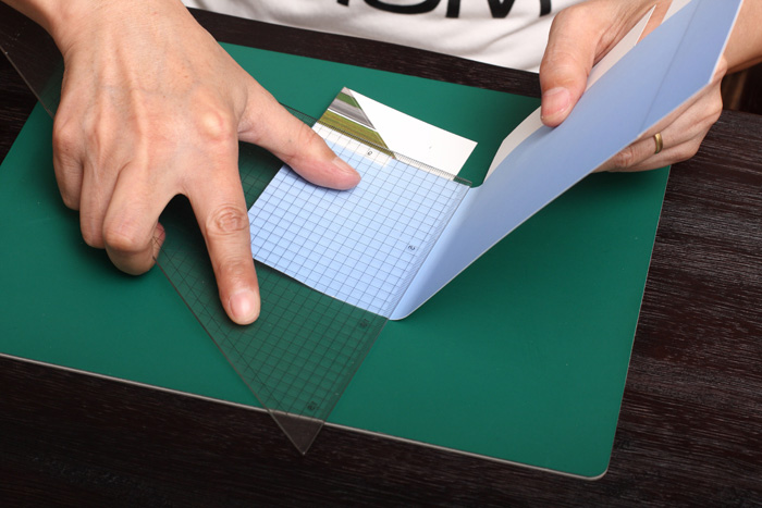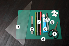 | 4.カッティングマット | カッターを使うときに紙の下にしきます。なければ厚紙や雑誌でも代用できますが、100円ショップなどでも売っています。 |