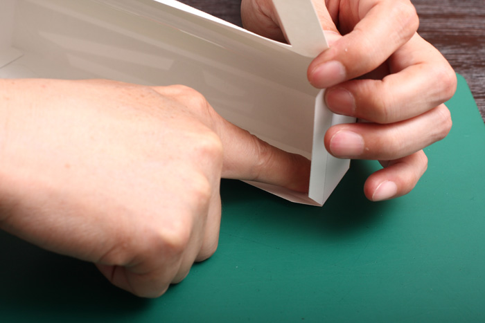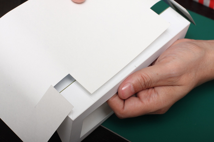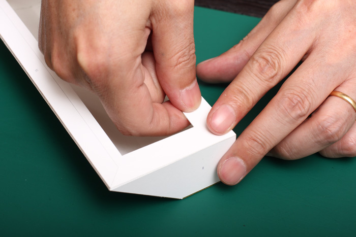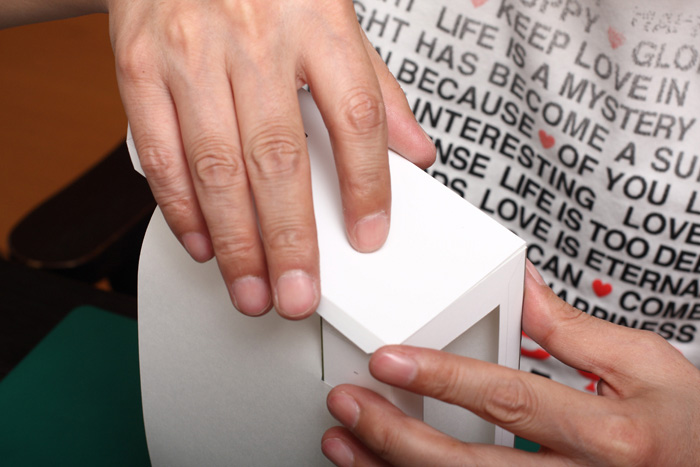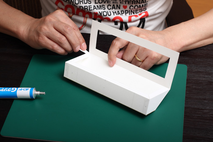 いよいよ一番外の箱部分となるパネル部分を外側から貼りつければ完成です。簡単なパーツばかりなのでていねいに仕上げてください。順番として、横、後ろ、天井部分をセットし、残っていたジオラマパーツのHSVを台座にセットしてからフロントパネルを貼り合わせると完成です。