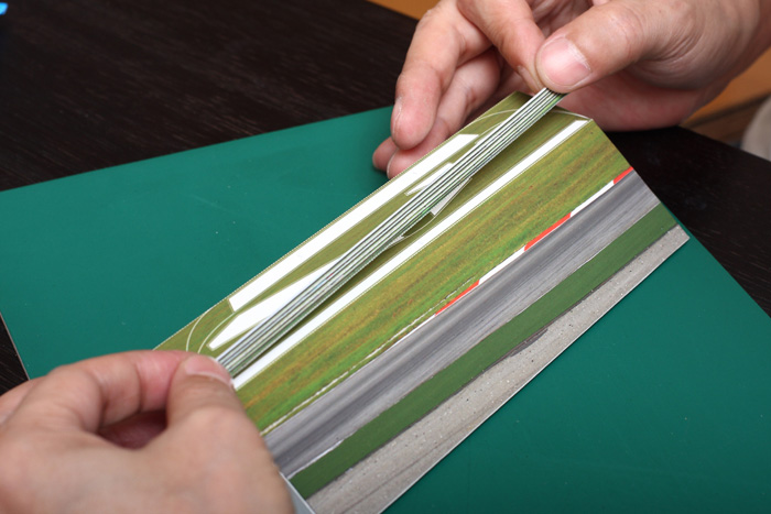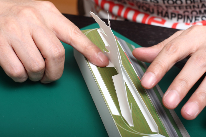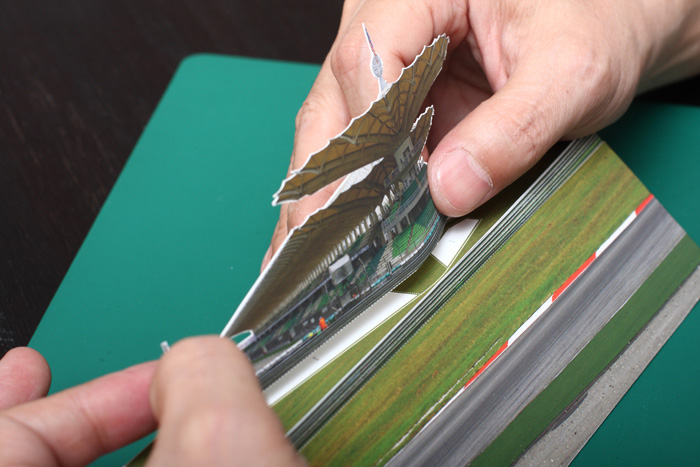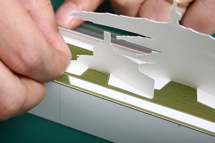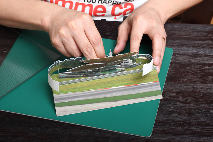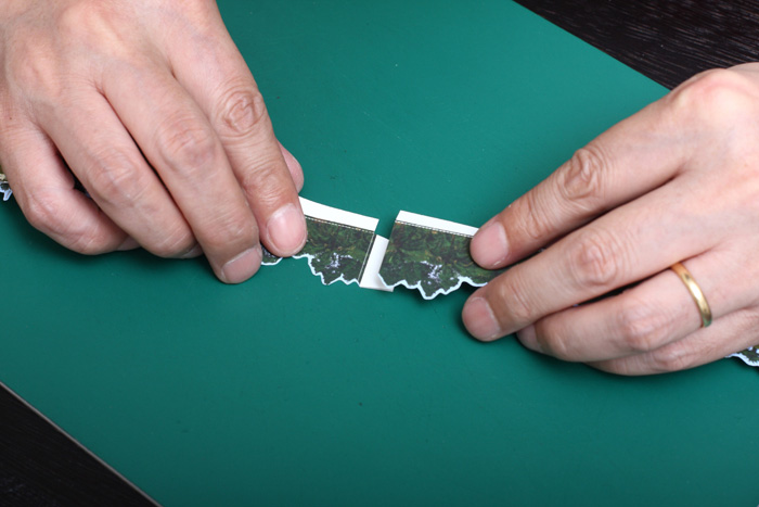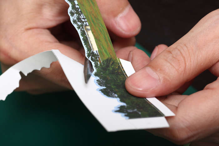 次に台座に設置するジオラマパーツの制作です。背景部分の切り抜きが複雑なものもありますが、丁寧にハサミやカッターで切り抜いてください。切り抜き枠線がありますが、背景画像ギリギリに切ったほうが仕上がりもきれいです。台座へののりづけは手前のパーツから貼りつけるのがコツです。