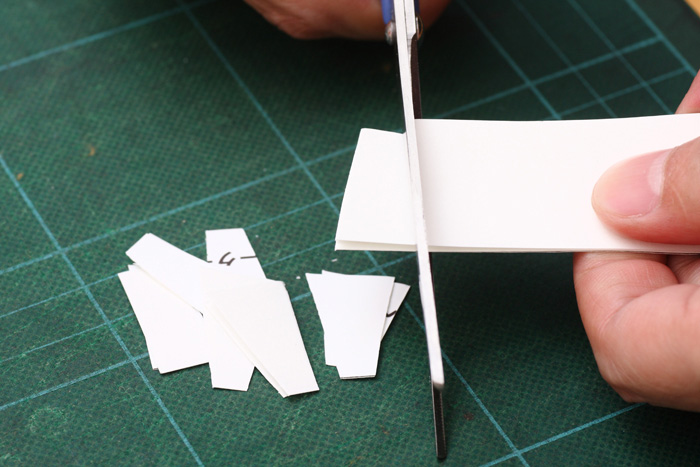 まず、台座部分を作ります。ペーパークラフトは「切る」「折る」「はる」「組み立てる」という各工程ごとにまとめて作業すると、手が慣れてくるので作業時間を短くすることができます。基本的な作り方は「ペーパークラフトの作り方講座」を参考にしてください。台座は台形の箱を作ることと同じなので、基本を習得するのに適しています。
