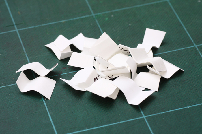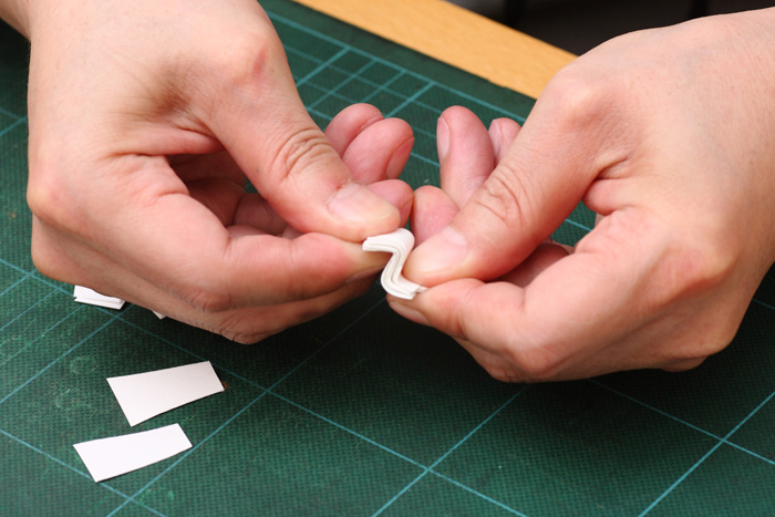 また、はりつけるときにボンドを伸ばすために使う紙のへらを、用意しておきましょう。紙のへらはクラフトを切り抜いた残りの紙を細かく切って作ります。