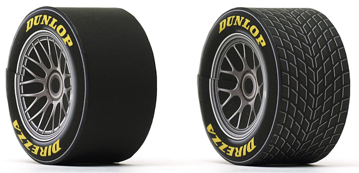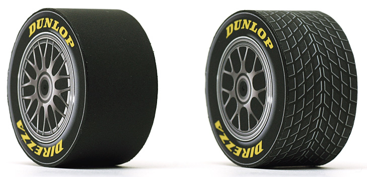 晴れの日に使用する溝のないスリックタイヤと、雨天時に使用する溝付きレインタイヤを用意した。