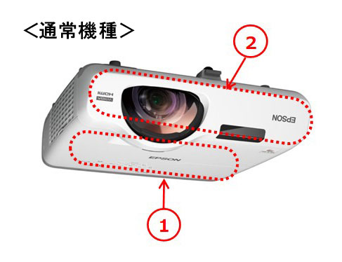 また、上記【3】記載の環境での使用は、各部の故障/投写映像の品質劣化/光学部品等の交換サイクルが短くなることがあるため、従来通り使用禁止の環境となります。こちらの「購入前のご注意」にプロジェクターの設置環境や天吊り設置についての注意事項などを掲載しておりますので、あわせてご確認ください。