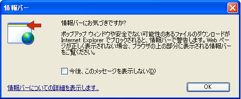 CDアルバムをHTML形式で作成した場合、ページ内の写真の拡大表示やページ内の動画の再生、またスライドショーの実行時に、以下の情報バーがInternet Explorerにアドイン表示され、処理が継続できません。![]() 同時に、以下の情報バーダイアログが表示される場合があります。 ![]() 回避方法 情報バーダイアログが表示された場合は、以下の操作手順で処理を続行できます。